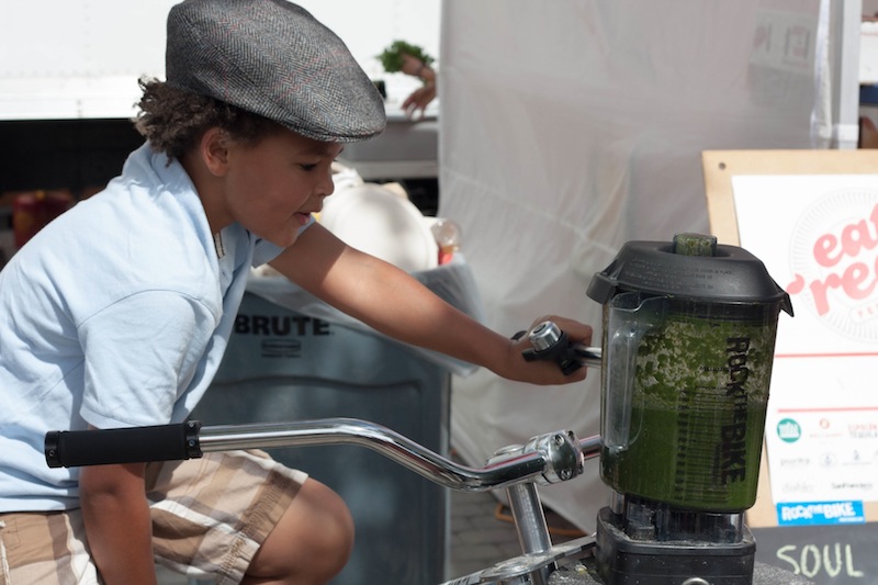 Les passants peuvent aussi aider en pédalant sur ce vélo qui permet d’écraser les herbes. J’ai un peu trop mangé évidemment, et il faisait chaud sous le soleil.