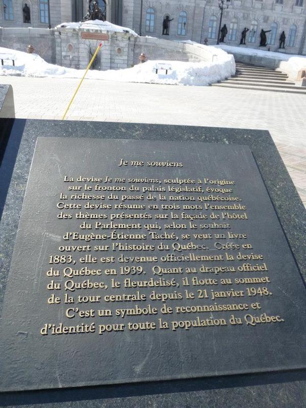 Québec abrite aussi le Parlement du Québec, avec le drapeau québécois qui flotte fièrement et la devise « Je me souviens », que l’on trouve sur toutes les plaques de voiture du Québec, évoque « la richesse du passé de la nation québécoise ».