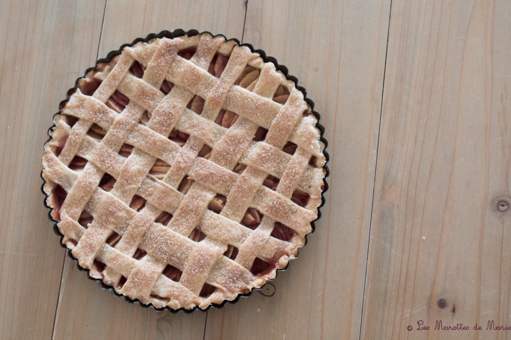 Etaler le reste de pâte au rouleau. Couper des bandes d’environ 2 cm de largeur. Déposer 6 à 7 bandes sur les pommes, en scellant un seul côté sur les bords et en les espaçant. Déposer les autres bandes en laissant une bande dessus, une autre en-dessous, sceller les bords et enlever le surplus de pâte.