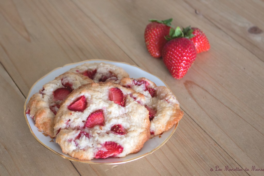 Les premières fraises sont arrivées… elles manquent encore un peu de goût, mais comme j’en ai eu dans mon panier bio, je les ai utilisées pour faire de délicieux cookies à la noix de coco et aux fraises. Des saveurs de l’été que l’on attend avec impatience !