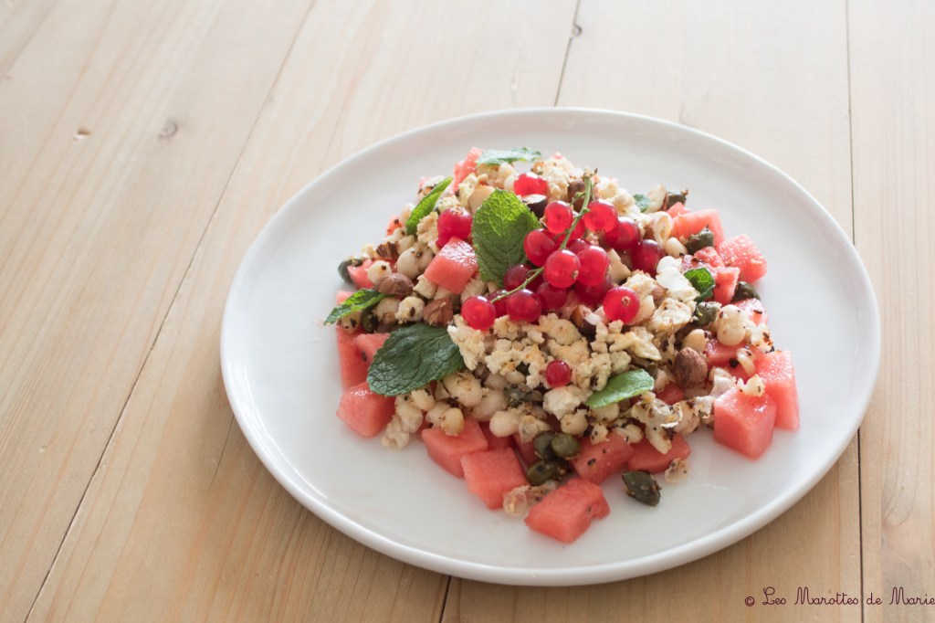 Avec le retour du soleil, c’est aussi une envie de repas plus légers, d’où des salades avec un mélange de plein de saveurs et de textures. Une petite pastèque, du tofu grillé et émietté à l’ail, des noisettes, quelques câpres, des feuilles de menthe, des groseilles, un peu de haricots blancs et une petite touche d’huile d’olive, et nous voici en plein été, avec de la douceur et de la fraîcheur… pour en profiter pleinement, tous les ingrédients peuvent être mis au frais plusieurs heures à l’avance.