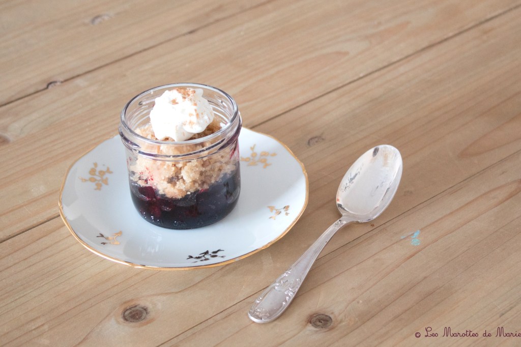 Un petit dessert pour changer de la traditionnelle bûche, qui se veut léger et gourmand : une verrine de Noël avec un crumble de myrtilles, et une crème de coco fouettée… Recette très simple où par contre, il faut préparer les différents ingrédients séparément car les myrtilles surgelées – ce n’est pas la saison des myrtilles fraîches et je suis en train de vider mon congélateur – rendent beaucoup d’eau.