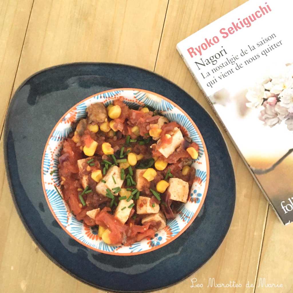Le matin est frais, on sent l’automne s’approcher, je lis donc un livre de circonstance : Nagori, la nostalgie de la saison qui vient de nous quitter, de Ryoko Sekiguchi, autour des saisons et de la nourriture. Et pour ce petit changement de saison, un plat qui réchauffe : du riz noir au maïs, tomates, oignons, champignons, épinards et paprika fumé… à préparer avec un reste de riz cuit, qu’il soit noir, complet ou blanc !