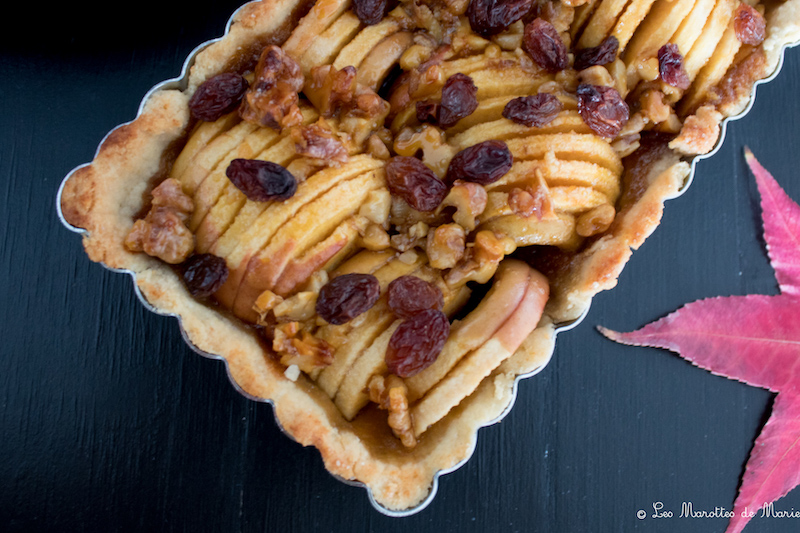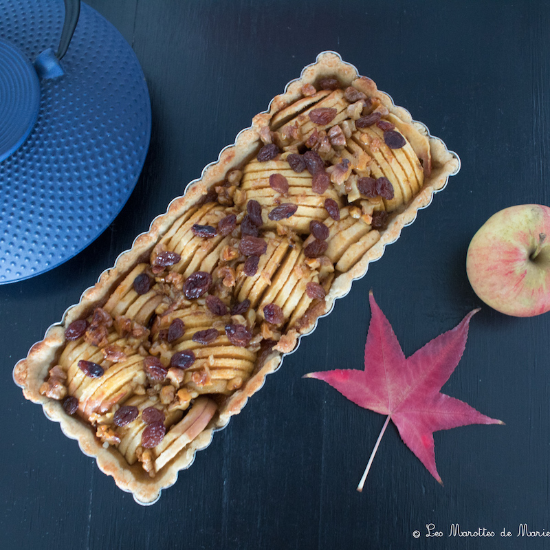 Une jolie recette d’automne parce que c’est la saison, avec une pâte faite avec différentes farines mais qui peut être réalisées qu’avec de la farine classique… et des noix caramélisées et des raisins au rhum – en option bien sûr !