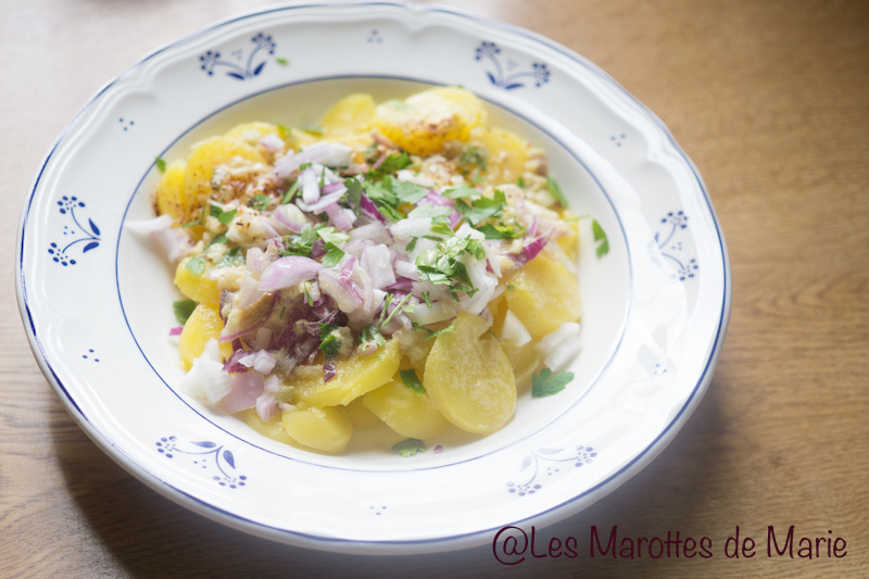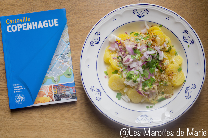 Pour prolonger les vacances, rien de mieux qu’une recette qui rappelle des souvenirs… Après deux semaines au Danemark, j’ai retrouvé mon chez moi, avec une envie de faire quelques recettes locales, glânées ici et là. Je dois dire que la gastronomie locale n’est pas foisonnante, et remplie de poissons marinés ou fumés, de sandwiches au pain noir, et de viennoiseries à la crème, pas beaucoup de vegan dans le traditionnel danois – mais il suffit de revisiter les recettes traditionnelles, comme cette salade de pommes de terre, que l’on trouve partout…